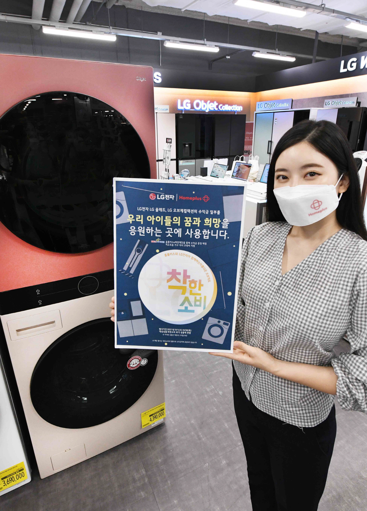 홈플러스는 '착한 소비'를 ESG 중점 추진 과제 중 하나로 선정해 기부 전용 상품 개발하고 소비자 캠페인 등을 통해 착한 소비 문화 확산에 기여한다는 방침이다. LG전자와 함께하는 이번 행사는 그 첫 번째 이벤트다.