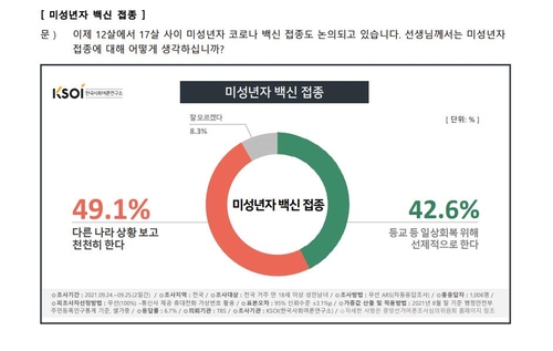 한국사회여론연구소(KSOI)가 TBS 의뢰로 지난 24∼25일 전국 만 18세 이상 1천6명에게 12∼17세 미성년자의 코로나19 백신 접종에 대한 생각을 물은 결과, "다른 나라 상황을 보고 천천히 해야 한다"는 응답이 49.1%였다.