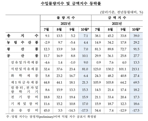 수입물량지수로 보면 상승률은 석탄·석유제품(81.0%), 제1차 금속제품(21.3%), 기계 및 장비(17.0%) 순으로 높았다.