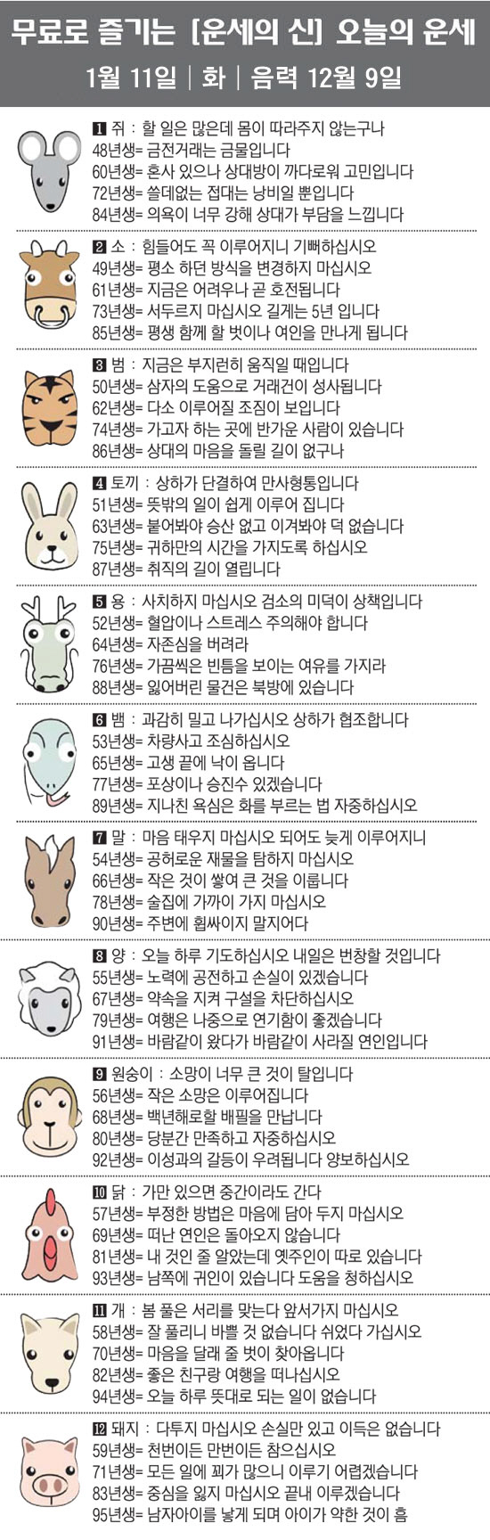 스포츠조선에서 제공하는 1월 11일(음력 12월 9일) 오늘의 운세입니다.