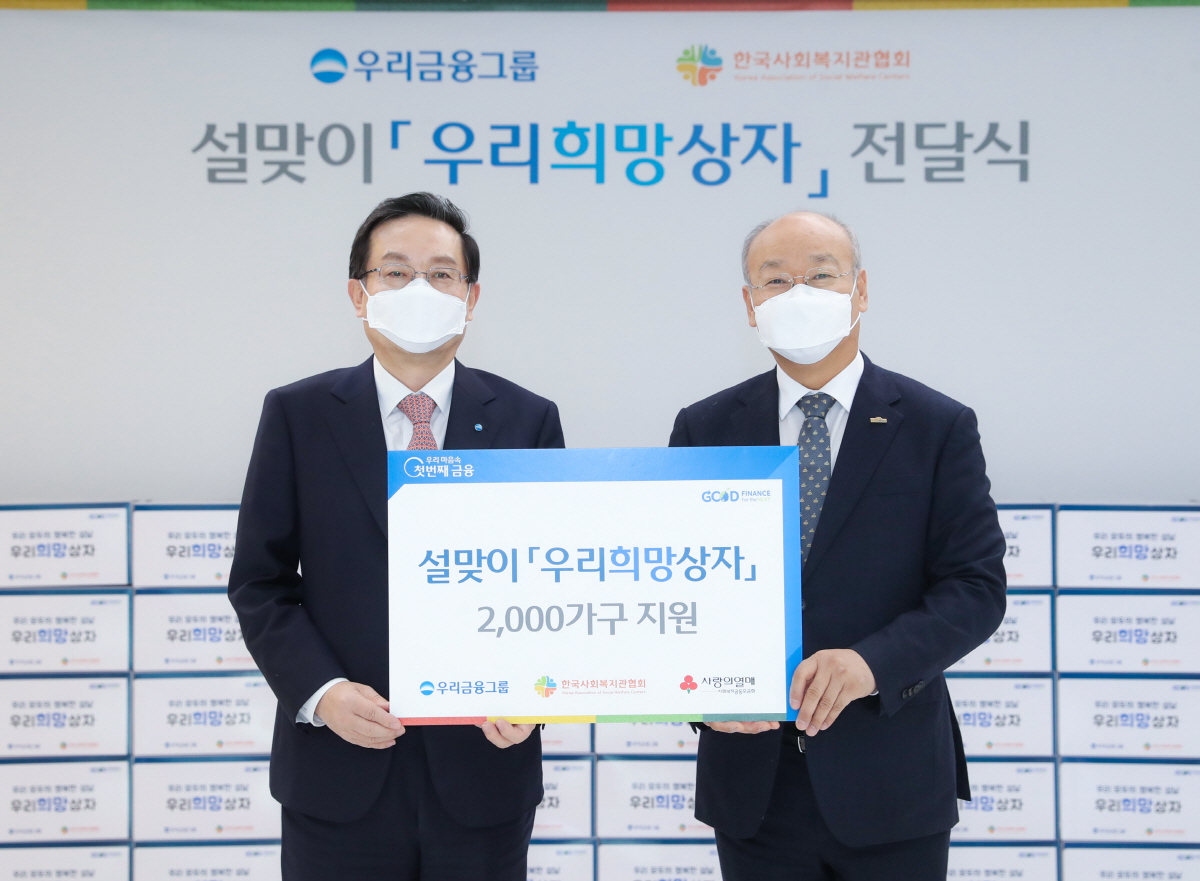 우리금융그룹은 서울 중구 회현동 우리금융 본점에서 손태승 회장과 한국사회복지관협회 남국희 협회장이 참석한 가운데 설맞이 '우리희망상자' 전달식을 가졌다고 24일 밝혔다.