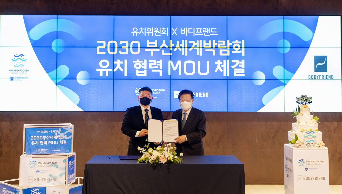 바디프랜드는 지난 26일 서울 강남구 바디프랜드 도곡타워에서 2030 부산세계박람회 유치위원회와 박람회 유치 협력을 위한 '힘이 되는 기업' 업무협약을 체결했다고 27일 밝혔다. 힘이 되는 기업은 부산세계박람회 유치를 지원하는 기업을 의미한다.