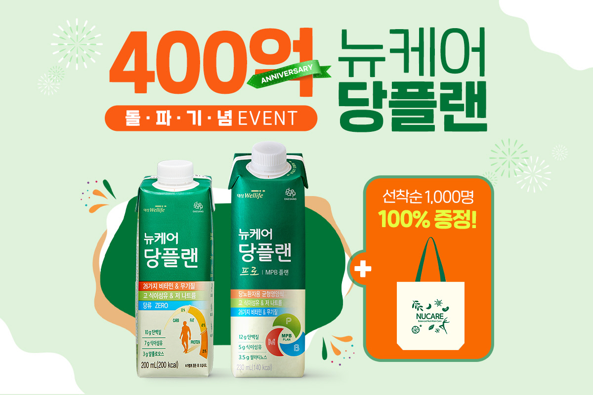 대상라이프사이언스㈜는 4월 한 달간 대상웰라이프몰에서 '뉴케어 당플랜' 400억 돌파 기념 이벤트도 진행한다. ▲뉴케어 당플랜 ▲뉴케어 당플랜 프로 등 뉴케어 2종을 2박스 이상 구매한 고객 1000명에게 뉴케어 에코백을 선착순으로 증정한다. 또한 퀴즈 이벤트 정답을 맞힌 고객을 대상으로 추첨을 통해 ▲쿠쿠저당밥솥(1명) ▲신세계 상품권 5만원 권(5명) ▲뉴프로지나 풋크림(30명) 등을 경품으로 제공한다.