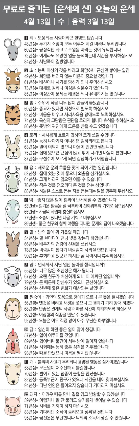 스포츠조선에서 제공하는 4월 13일(음력 3월 13일) 오늘의 운세입니다.