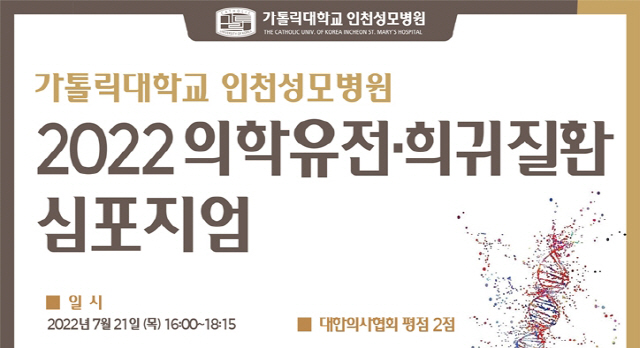 가톨릭대학교 인천성모병원(병원장 홍승모 몬시뇰)이 오는 21일 2022 의학유전·희귀질환 온라인 심포지엄을 개최한다.