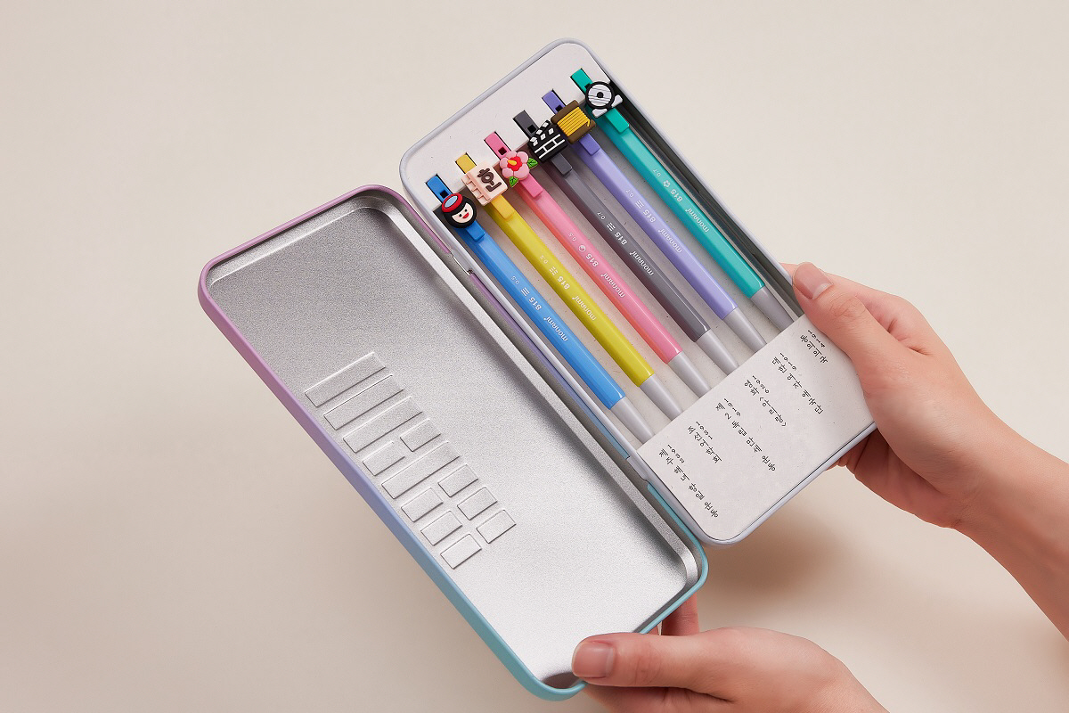153 CLIP 8.15 광복절 기획세트 잉크 색상은 모두 흑색이며 0.5mm와 0.7mm 필기선 두 종류로 나뉜다. 틴케이스로 구성된 패키지에는 태극기의 4괘인 건?곤?감?리를 축약적으로 보여주는 문양을 새겼으며, 볼펜 축에도 태극 및 무궁화 문양을 넣어 광복절의 의미를 강조했다.