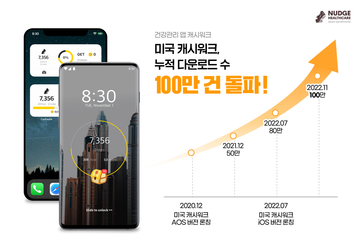 넛지헬스케어㈜는 자사에서 운영하는 애플리케이션(앱) '캐시워크'의 미국 누적 가입자 수가 100만명을 돌파했다고 27일 밝혔다. 미국시장 진출 2년여 만에 이뤄낸 성과다.