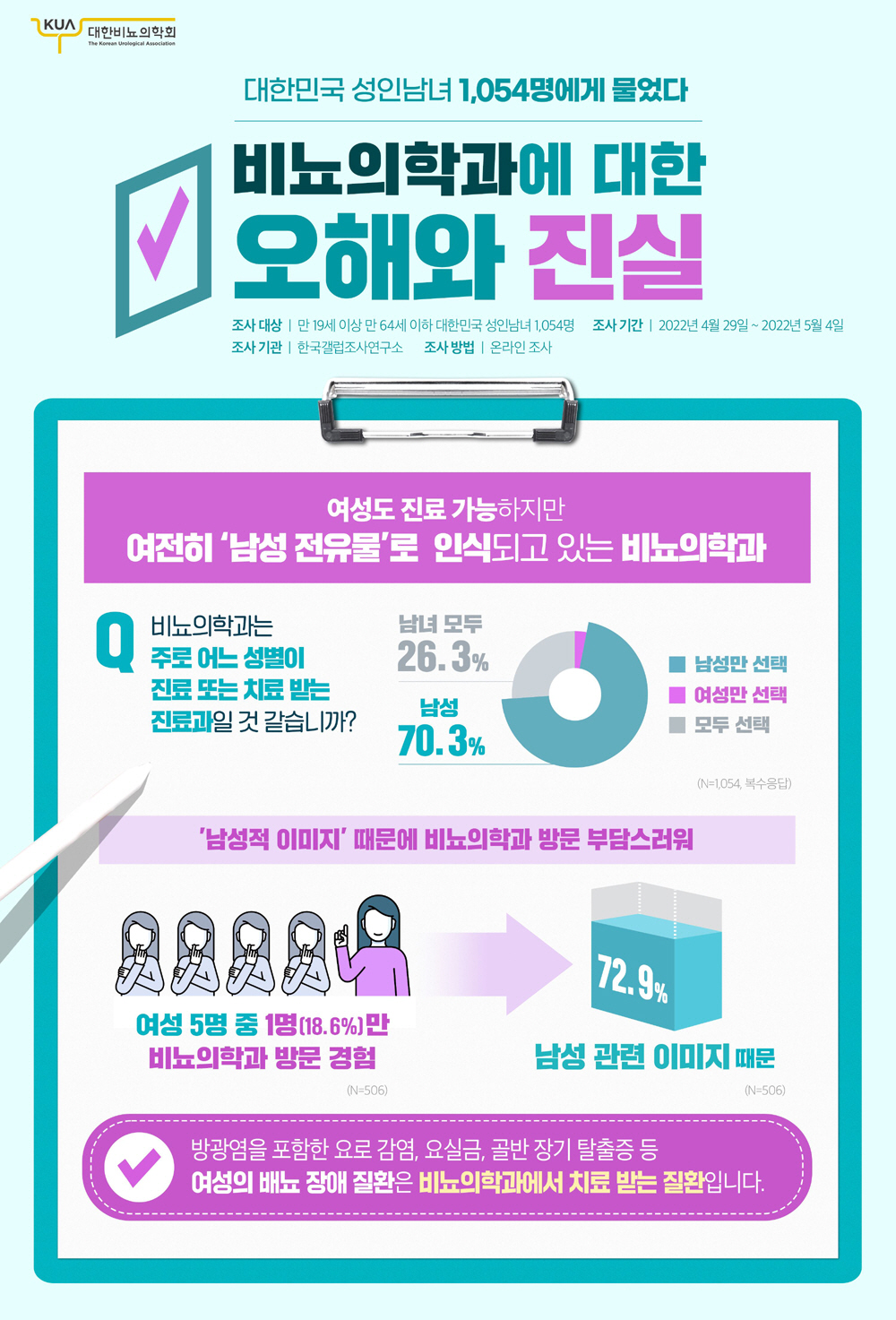 이는 대한비뇨의학회가 여론조사전문기관인 한국갤럽조사연구소에 의뢰해 2022년 4월 29일부터 5월 4일까지 만 19세 이상 만 64세 이하 대한민국 성인남녀 1054명을 대상으로 비뇨의학과에 대한 인식을 조사한 결과다.