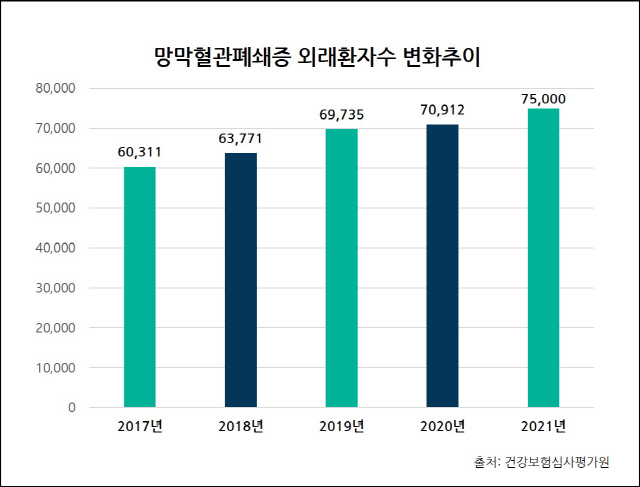 건강보험심사평가원에 따르면 망막혈관폐쇄증으로 외래 진료를 받은 환자 수는 2017년 6만311명에서 2021년 7만5000명으로 5년 사이 약 24% 증가했다.