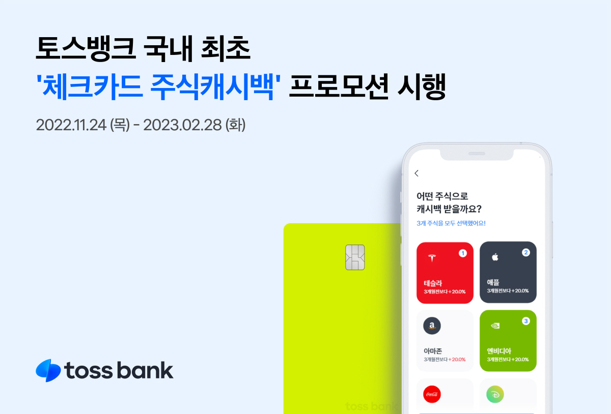 토스뱅크가 24일부터 국내 최초로 '체크카드 주식캐시백' 프로모션을 시행한다.