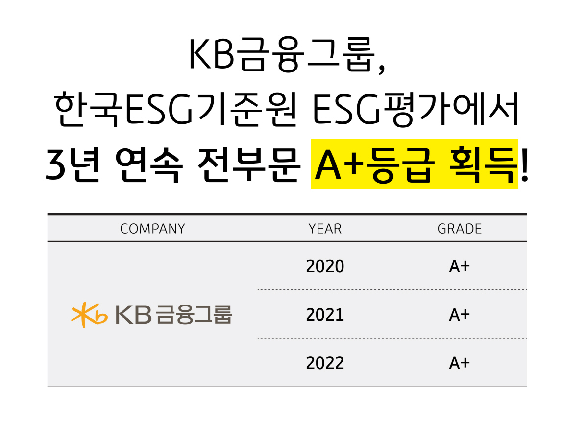 KB금융그룹은 24일 한국ESG기준원(이하 KCGS)이 발표한 '2022년 KCGS ESG 평가 및 등급 발표'에서 금융회사로서 유일하게 3년 연속 ESG 통합등급과 환경(E)·사회(S)·지배구조(G) 전 부문에서 A+등급을 획득했다고 밝혔다.
