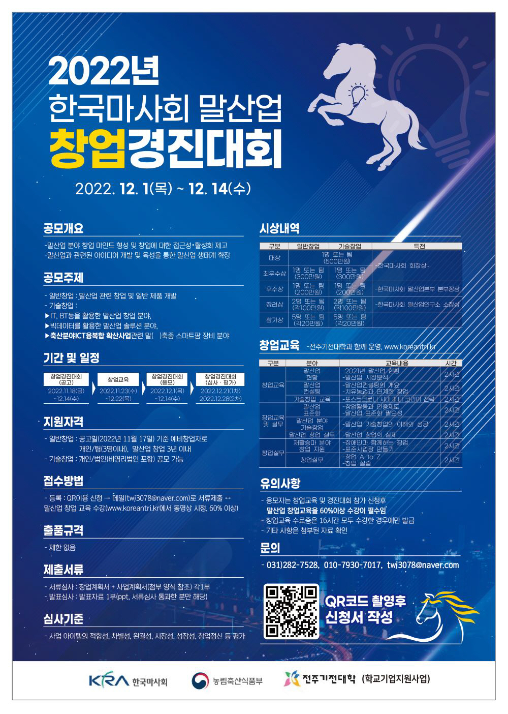 금번 경진대회에 참가를 희망하는 이들은 11월 23일부터 전주기전대학과 공동으로 실시하는 온라인 창업교육의 60%이상을 수강해야 경진대회 참여 자격을 얻을 수 있다. 온라인 교육에는 말산업에 대한 내용과 함께 '포스트 코로나 시대 메타 코리아 전략', '말산업 기술창업의 이해와 성공' 등 기술창업분야 교육 내용도 포함되어 있다.
