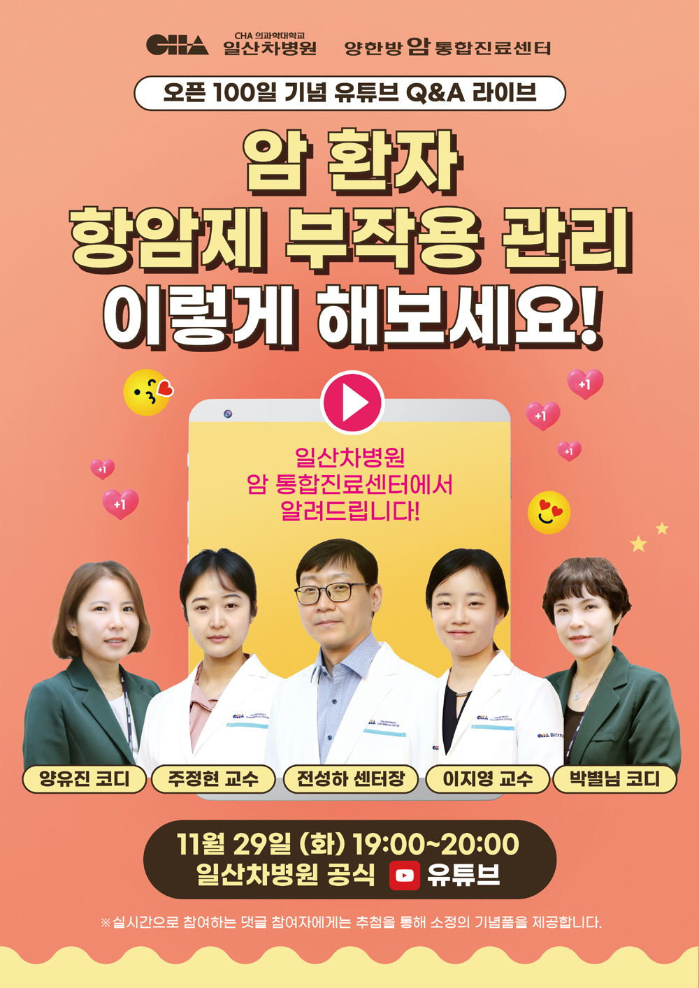 차 의과학대학교 일산차병원 암 통합진료센터(센터장 전성하)는 오는 29일 오후 7시 오픈 100일을 기념해 유튜브 라이브 클래스 '암 환자, 항암제 부작용의 오해와 진실' 편을 진행한다.