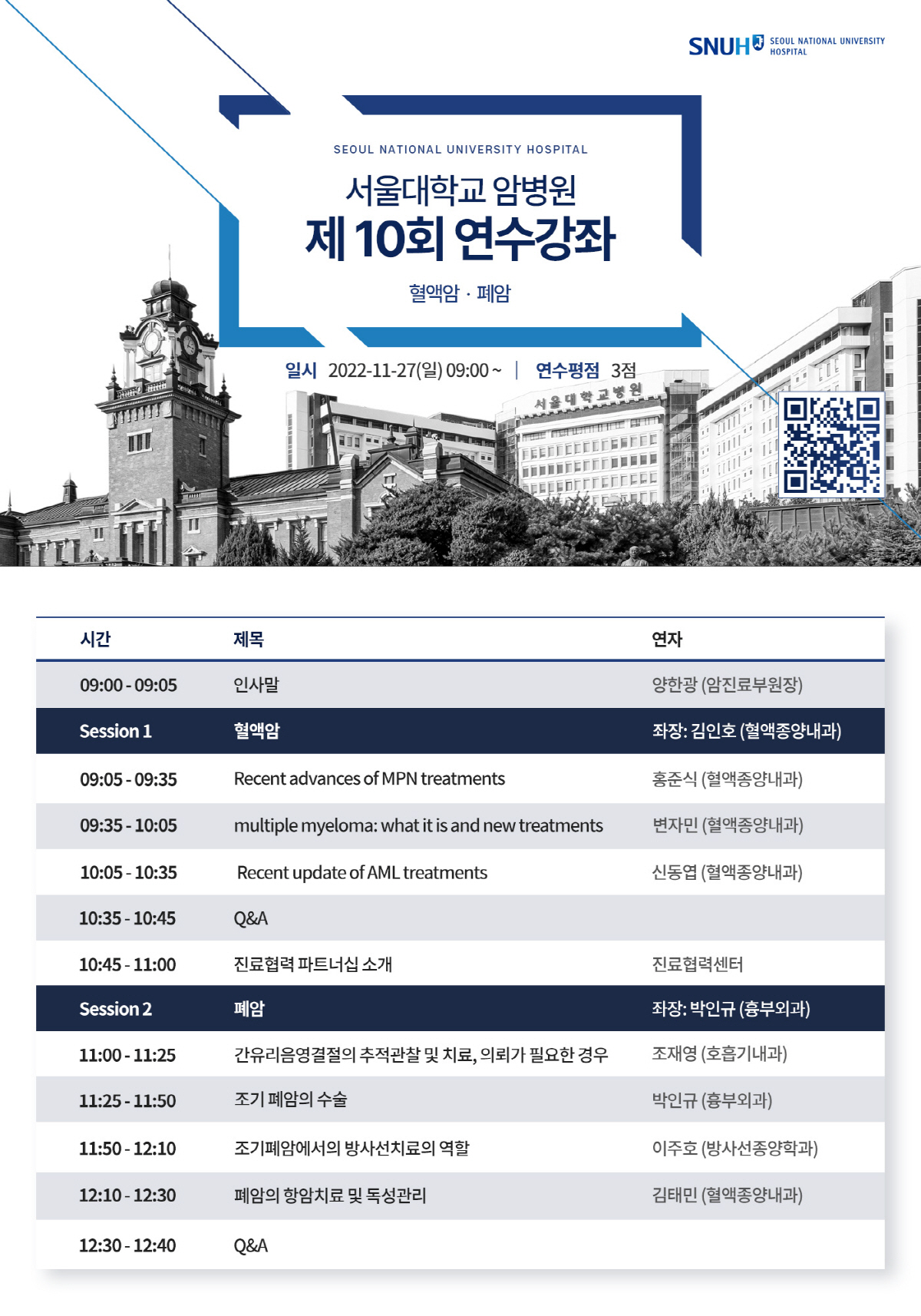 서울대암병원은 오는 27일 오전 9시부터 '혈액암·폐암'을 주제로 온라인 연수강좌를 개최한다고 밝혔다.
