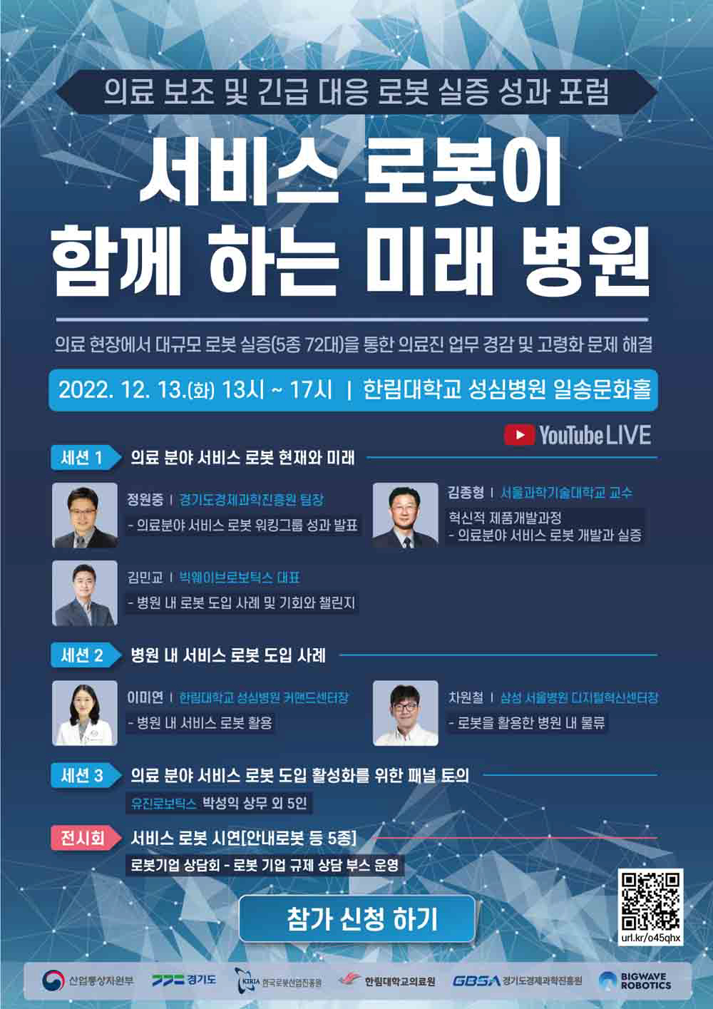 한림대학교성심병원은 오는 12월 13일 오후 1시 한림대성심병원 일송문화홀에서 경기도경제과학진흥원과 공동으로 '고령화 의료 문제 해결을 위한 의료진 보조 및 긴급대응 로봇 융합 실증'사업의 성과 포럼을 개최한다.