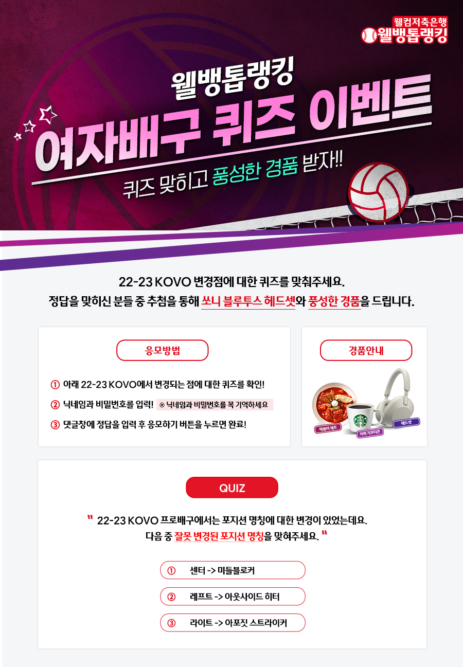 웰컴저축은행이 '2022-2023 V리그 여자부' 진행에 발맞춰 프로여자배구팬들을 대상으로 2라운드부터 매 라운드마다 '웰뱅톱랭킹 여자배구 이벤트'를 진행한다고 5일 밝혔다.
