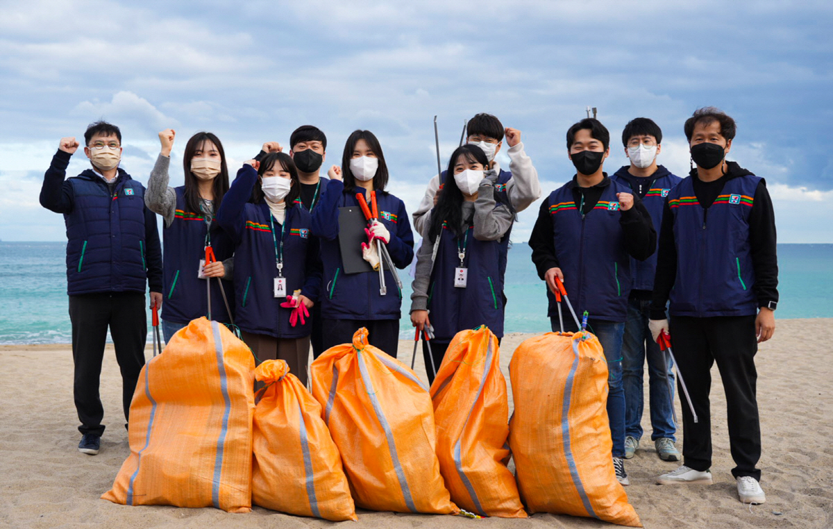 세븐일레븐 부산지사 임직원들은 지난 10월 26일 부산 임랑해수욕장에서 걸으면서 쓰레기를 줍는 플로깅(Plogging)을 진행했다. 세븐일레븐은 지난 9월 임랑해수욕장을 반려해변으로 입양했다. 전국 세븐일레븐 점포 POS 화면과 옥외광고를 통해 해양쓰레기 저감과 반려 해변 제도에 대한 홍보영상도 상영 중이다.