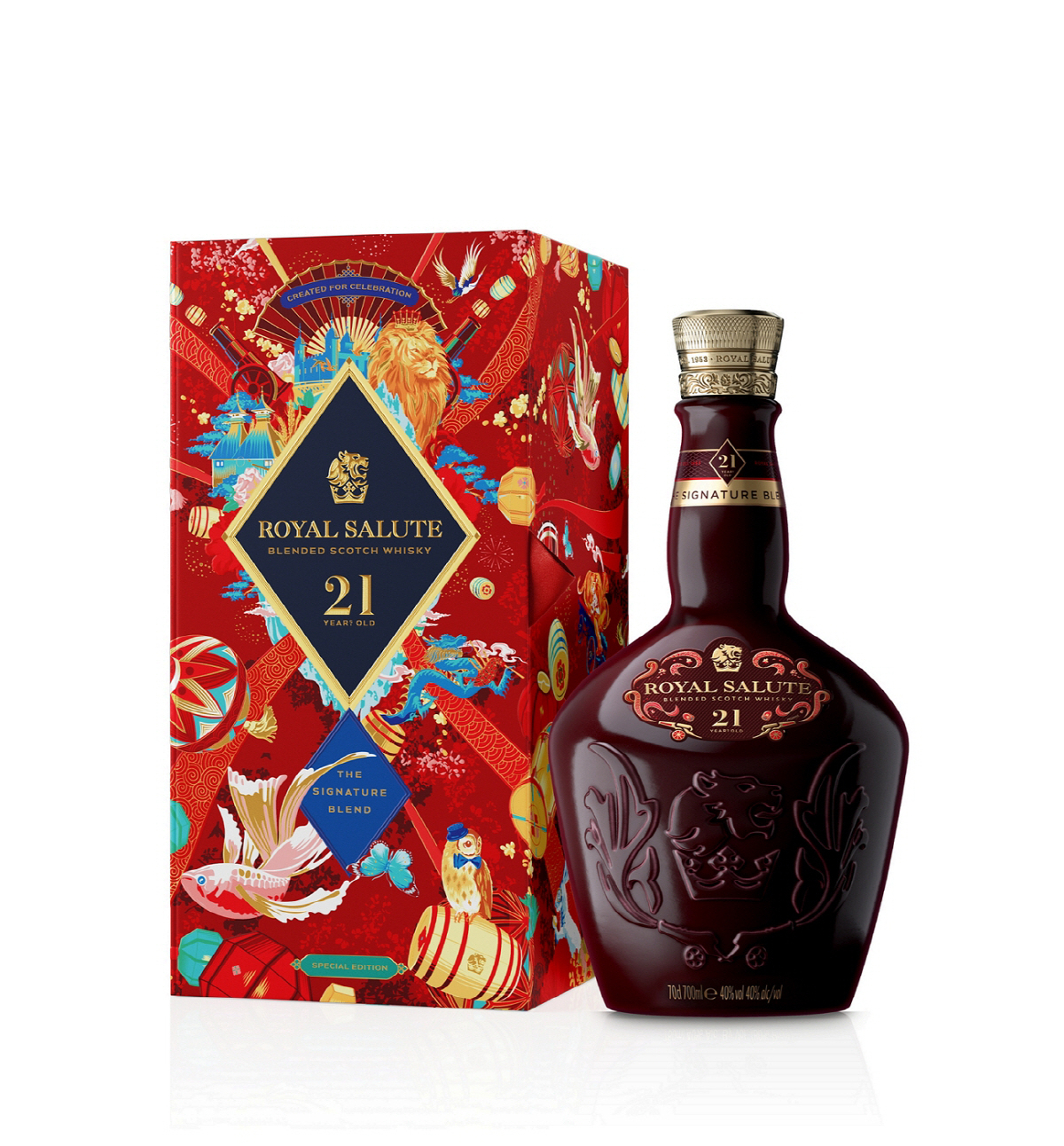로얄살루트 21년 셀러브레이션 패키지는 영국 런던에서 주로 활동을 펼치고 있는 아티스트 트라잔 지아(Trajan Jia)가 직접 참여, 동양의 설 문화를 그만의 아이코닉한 스타일로 완성했다. 평소 밝고 다채로운 컬러의 디자인을 주로 선보이는 트라잔 지아는 설 명절의 상징적 요소들과 로얄살루트의 헤리티지를 그의 시선으로 재해석해 이번 패키지에 화려하면서도 정교하게 표현해 냈다.
