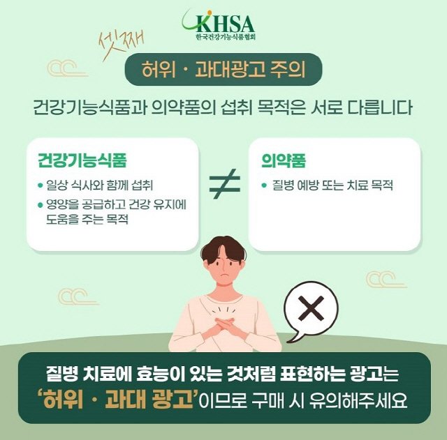허위·과대광고도 주의해야 한다. 건강기능식품은 일상식사와 함께 섭취했을 때 영양을 공급하고 건강에 도움이 되는 식품이며, 질병을 치료할 수 있는 의약품과 그 목적이 다르다. 따라서 마치 질병치료에 효능이 있는 것처럼 표현하는 광고는 허위·과대광고이므로 피해야 한다. 또 식약처에서 판매를 허가한 건강기능식품은 유통 전에 전문가들로부터 표시·광고 사전심의를 받으며, 심의 통과 시 심의필 마크를 기재할 수 있다.