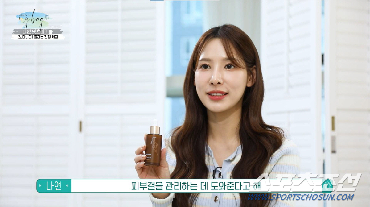 이나연이 자신의 피부 진정회복 꿀템을 소개하고 있다. 사진출처=왓츠인마이백