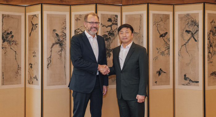 ◇이용욱 SK머티리얼즈 사장과 댄 암만 엑손모빌 저탄소 솔루션 대표가 지난 21일 서울 종로구 SK서린빌딩에서 블루암모니아 프로젝트 추진에 대한 주요 조건 합의서(HoA)를 체결하고 기념사진을 찍고 있는 모습.