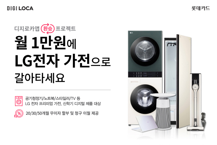 롯데카드가 디지로카앱에서 LG전자와 애플의 최신 제품을 매월 저렴한 결제금액으로 구입할 수 있는 '환승가전 프로젝트'를 오픈했다고 6일 밝혔다.
