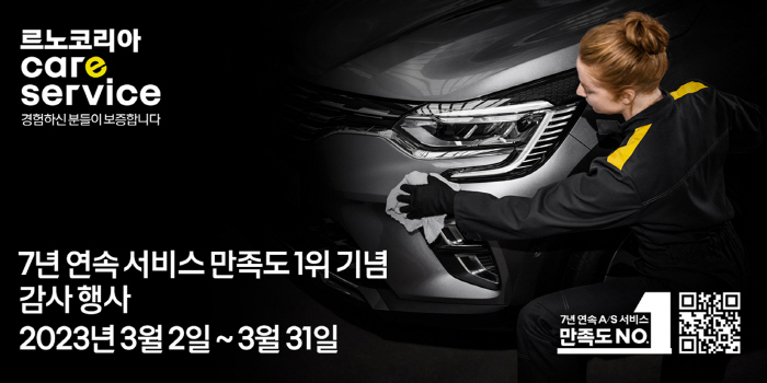 르노코리아자동차는 자사 AS 서비스에 대한 7년 연속 고객 만족도 1위 달성을 기념해 '특별 고객 감사 행사'를 3월 말까지 실시한다고 밝혔다.