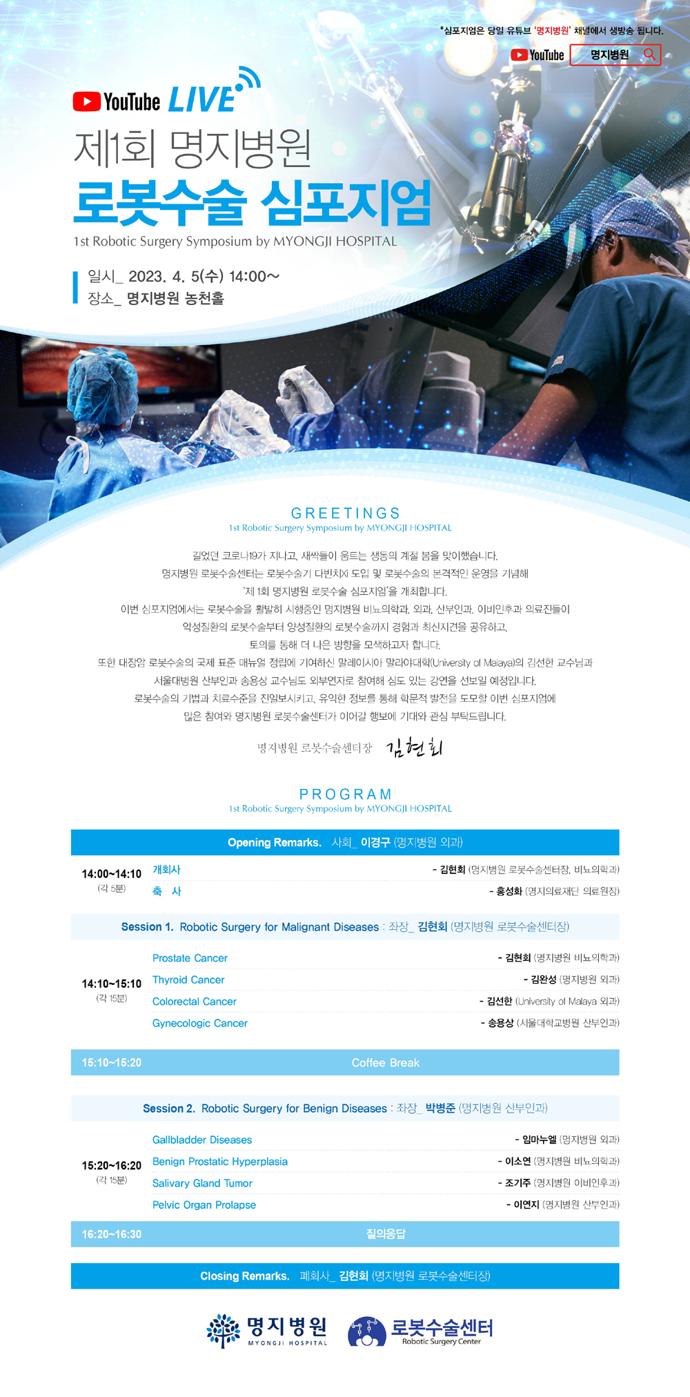 양성질환의 로봇수술에 대한 최신 지견을 소개하는 두 번째 세션에서는 ▲담낭질환(임마누엘 명지병원 외과 교수) ▲전립선비대증(이소연 명지병원 비뇨의학과 교수) ▲침샘종양(조기주 명지병원 이비인후과 교수) ▲골반장기탈출증(이연지 명지병원 산부인과 교수) 등이 다뤄진다.