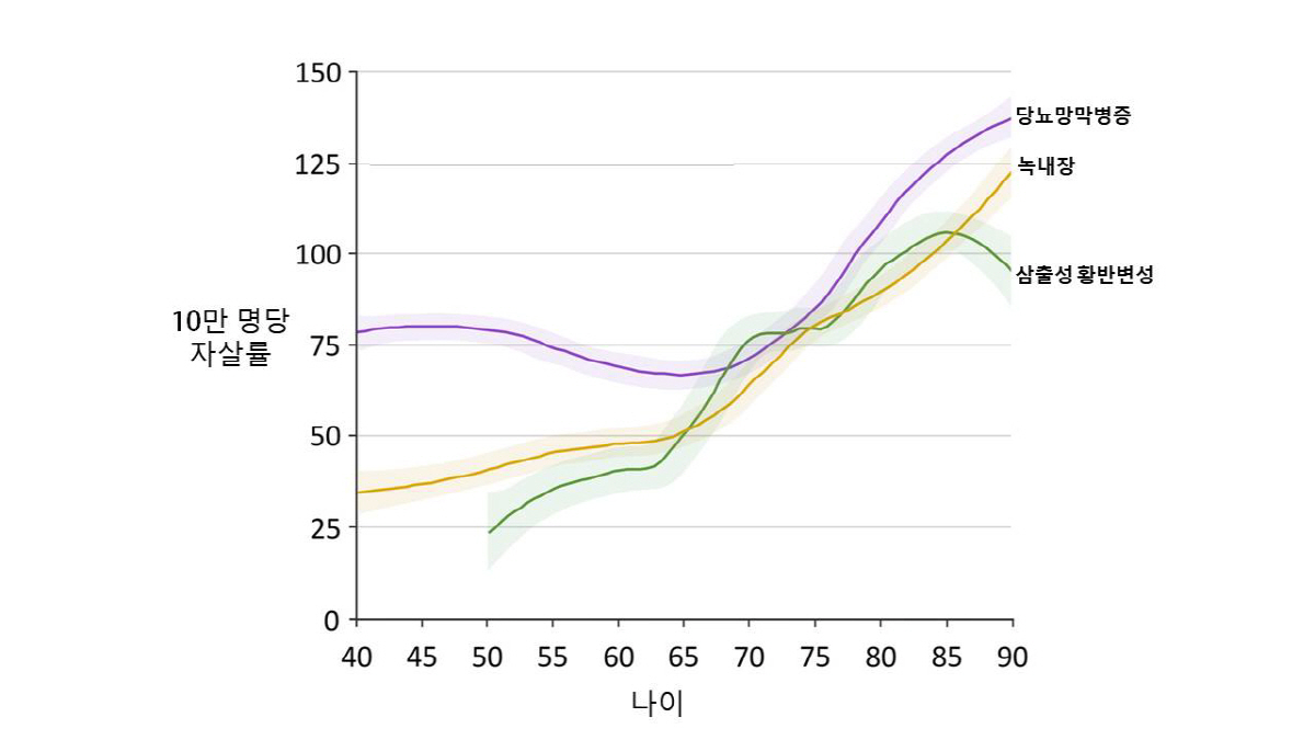 또한 주요 3대 실명질환 환자의 연령별 자살 사망률은 녹내장의 경우 나이가 들수록 꾸준히 증가했다. 당뇨망막병증의 경우 50~70세 사이에서 다소 감소했으나 그 이후 계속 증가했다. 황반변성의 경우 80세 후반에 가장 높은 자살 사망률을 나타냈다.
