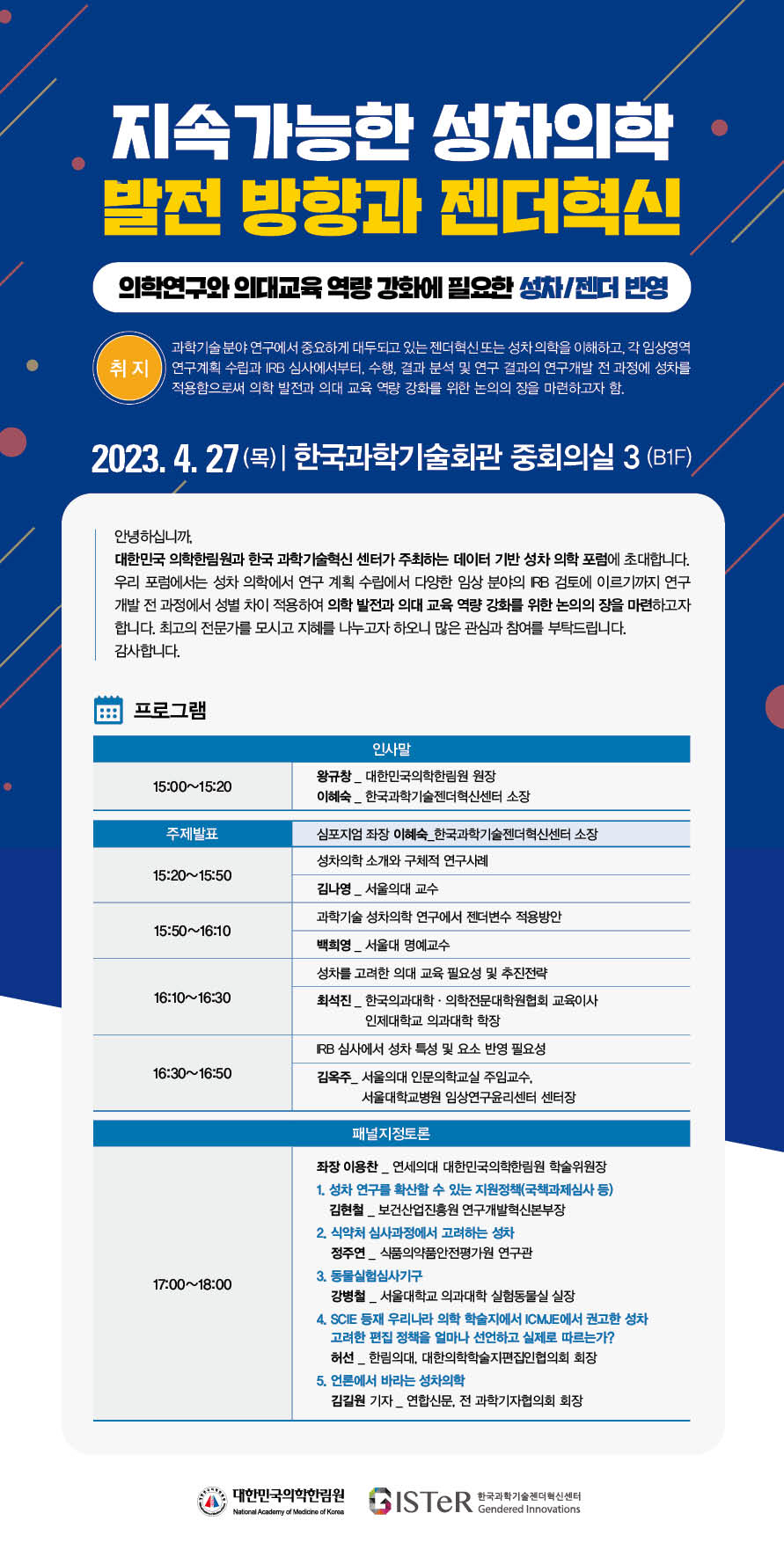 한국과학기술젠더혁신센터(소장 이혜숙, 이하 젠더혁신센터)와 대한민국의학한림원(원장 왕규창)은 오는 27일 과학기술회관에서 '지속가능한 성차의학 발전 방향과 젠더혁신' 포럼을 개최한다.