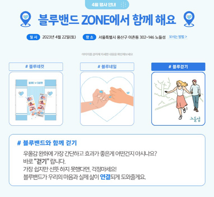 마지막 세 번째로 블루밴드와 함께 걷기 존이 마련된다. 이 존에서는 우울증 완화에 가장 간단하고 효과적인 방법인 걷기를 독려하고 우울감이 느껴질 때 혼자 갇혀 있기 보다는 밖으로 나와 가볍게 걷는 행위를 통해 고립을 벗어나 세상과 연결될 수 있다는 점을 소개하고 강조할 예정이다.