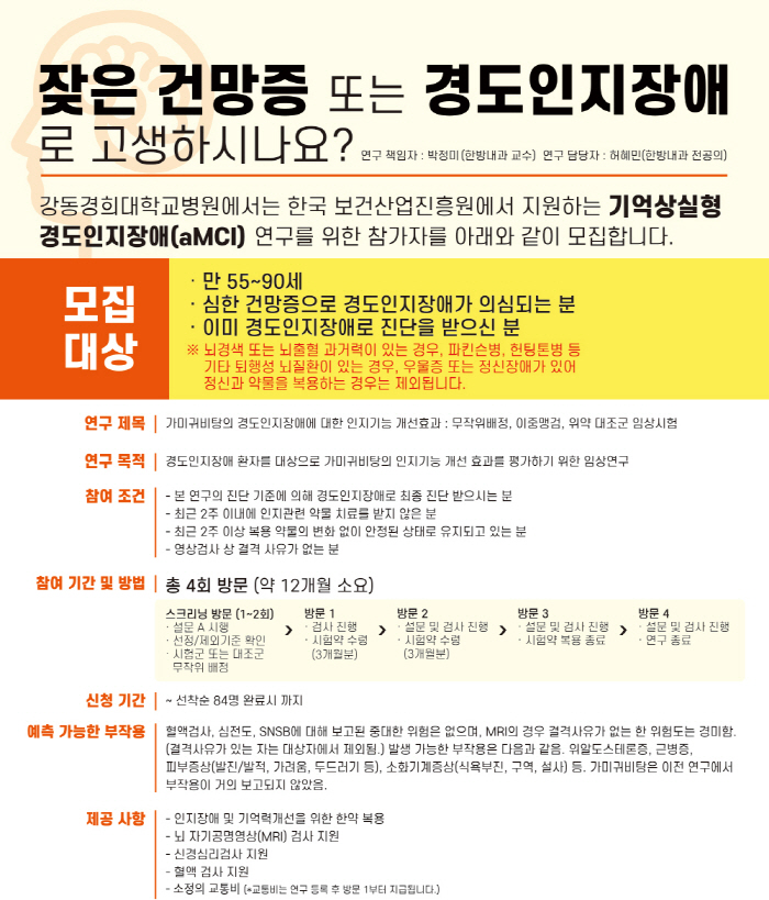 강동경희대학교한방병원 뇌신경센터 한방내과 박정미 교수팀은 경도인지장애에 대한 가미귀비탕의 인지기능 개선 효과 및 안정성을 평가하기 위한 임상시험 참여자를 모집한다.