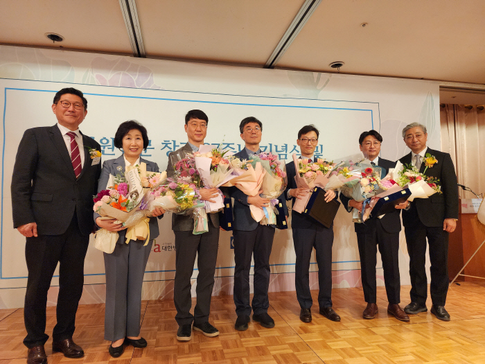 19일 서울 중구 롯데호텔에서 열린 '제13회 종근당 존경받는 병원인상' 시상식에서 홍경섭 인천세종병원 진료부원장(사진 왼쪽에서 3번째)이 수상후 윤동섭 대한병원협회장(사진 맨 오른쪽)과 김영주 종근당 대표이사(사진 맨 왼쪽) 등과 기념촬영하고 있다.