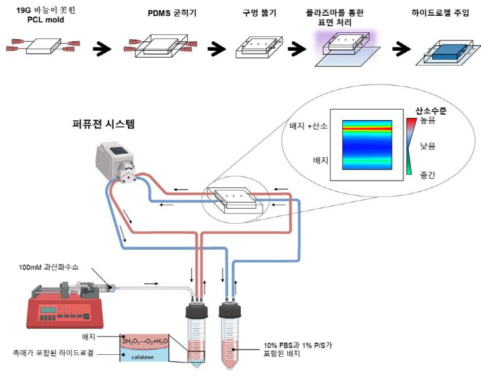 개발 시스템에서는 과산화수소가 촉매와 만나 산소와 결합하고 수소와는 분리하는 산화환원을 일으켜 산소가 만들어진다. 산소는 배지를 지나 하이드로겔 안에서 확산해 다양한 산소 농도를 갖춘 공간 구성을 띈다. 세포배양 시스템 공간은 실제 신체 산소 농도의 상대 비율에 따라 높음(42.72%), 중간(17.33%), 낮음(9.67%)으로 구분했다.