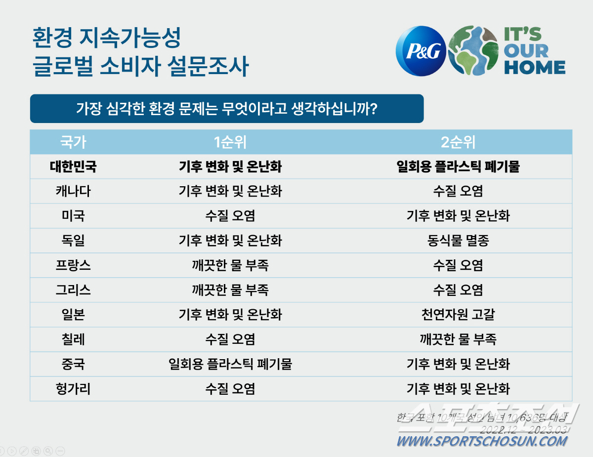 예현숙 상무는 "사업장 및 공급망 내 탄소 감축뿐만 아니라, 가정 내 탄소 감축도 중요하다"며, "소비자들이 매일 사용하는 제품을 만드는 생활용품 기업으로서 소비자들의 LCA 이해도를 높이고 가정 내 습관 변화를 유도하기 위해 노력할 계획"이라고 전했다. 또 "생활용품을 제조하는 글로벌 기업으로서, 피앤지는 생활 속 작은 행동들이 어떻게 의미있는 변화를 만들어낼 수 있는지에 대한 정보를 지속적으로 제공하고 소비자 및 다양한 이해관계자들과 함께 노력할 것"이라고 강조했다. 전상희 기자 nowater@sportschosun.com