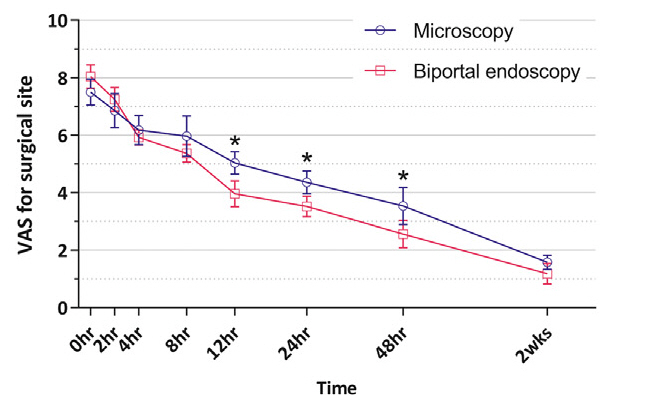 연구 결과 양방향 내시경 수술법은 현미경 수술법과 비해 근육을 덜 손상시키고 수술 후 통증이 적어 회복에 유리한 것으로 나타났다. 아울러 수술 흉터도 극히 적게 남았다. 이외 ▲부작용 ▲재발률 ▲입원기간 ▲수술시간 ▲수술 후 합병증 등에서는 비슷한 임상 결과를 보였다.
