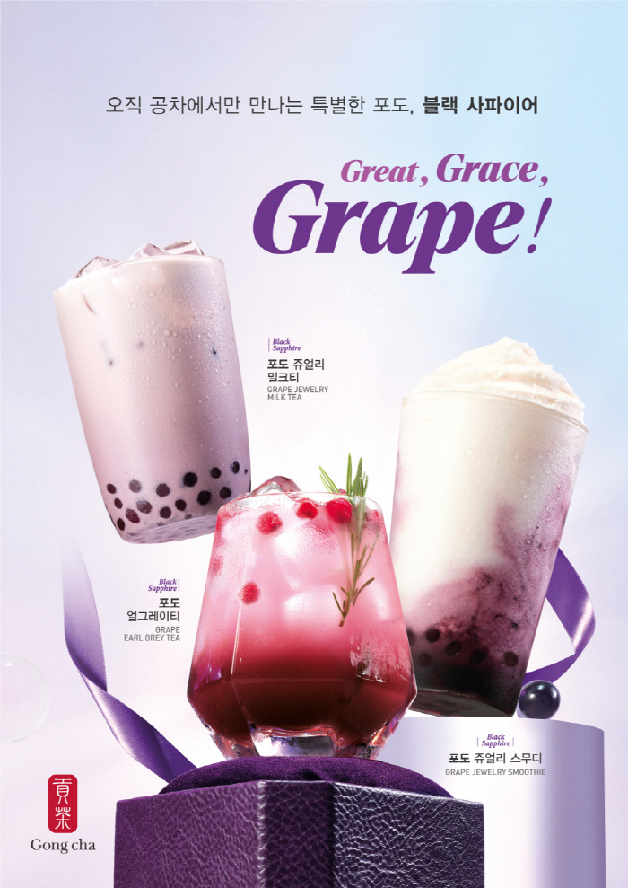 3일 공차코리아에 따르면 신메뉴는 블랙사파이어 포도를 베이스로 한 '블랙사파이어 포도 얼그레이티', '블랙사파이어 포도 쥬얼리 밀크티', '블랙 사파이어 포도 쥬얼리 스무디' 총 3종이다. 신맛은 적고 단맛이 강한 블랙사파이어 포도 본연의 맛을 그대로 살린 게 특징이다.