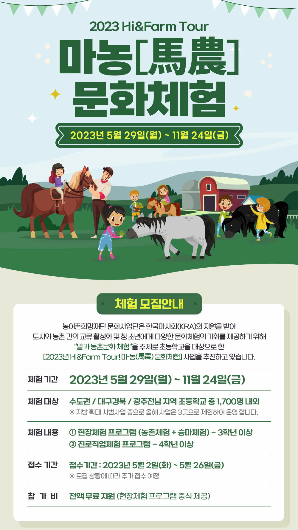 한국마사회와 함께하는 농어촌희망재단이 '2023년 Hi&Farm Tour! 마·농문화체험'에 참여할 학교를 모집하고 있다.