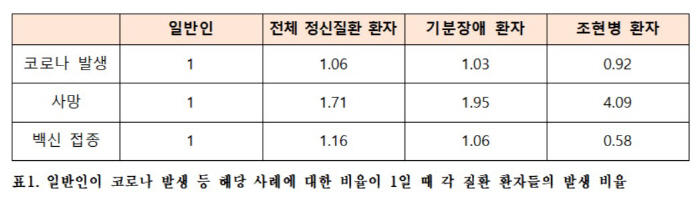 분당서울대병원 가정의학과 이혜진 교수팀(서울대병원 공공진료센터 이진용 교수(건강보험심사평가원 연구소장 파견 근무), 이동욱 교수 인하대병원 직업환경의학과)은 정신질환 환자가 감염병에 대한 취약 규모와 정도를 다루고 이에 따른 효율적인 공중보건 정책을 제안하기 위해 연구를 실시했다.