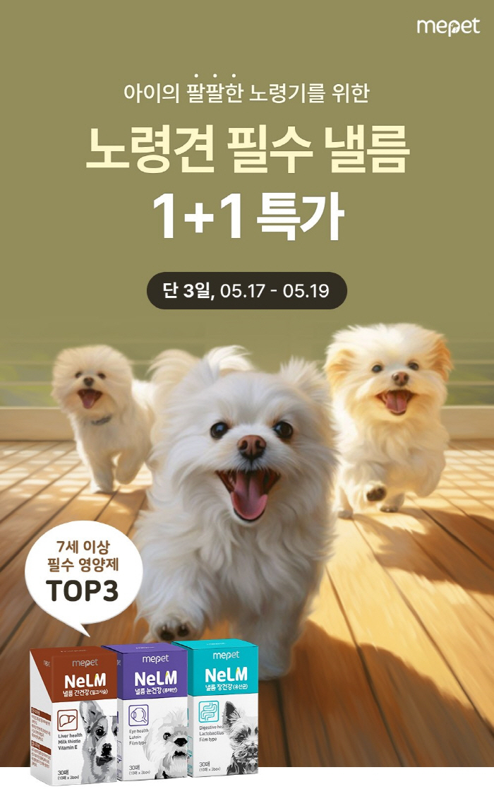 이번 이벤트는 프리미엄 반려동물 영양제 낼름의 n+n 행사로, 낼름 본품을 구입하면 개수에 따라 낼름을 추가로 증정한다. 노령견에게 필수인 눈, 간, 유산균 영양제를 대상으로 기본 50% 할인이 적용된다. 2개 이상 구매할 경우 할인 쿠폰이 추가로 제공되어 기존 가격의 50% 이상 할인 받을 수 있다. 또한, 인지력 향상에 도움이 되는 찢어먹는 지니어스틱과 영양 캡슐이 박힌 캡슐츄를 각각 15% 할인된 가격에 만나볼 수 있다.