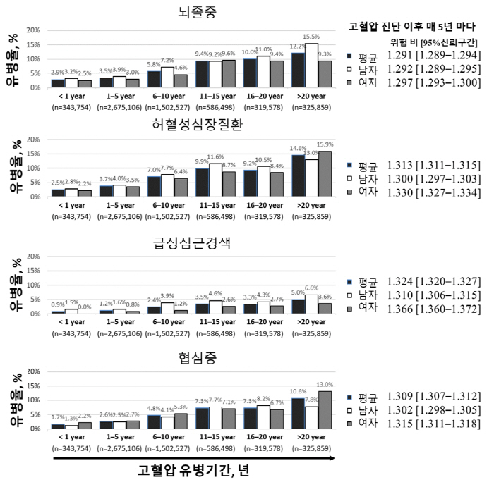 그 결과 고혈압 병력이 20년 이상 되면 뇌졸중은 12.2%, 허혈성심장질환 14.6%, 심근경색 5.0%, 협심증 10.6%를 겪게 되는 것으로 나타났다.