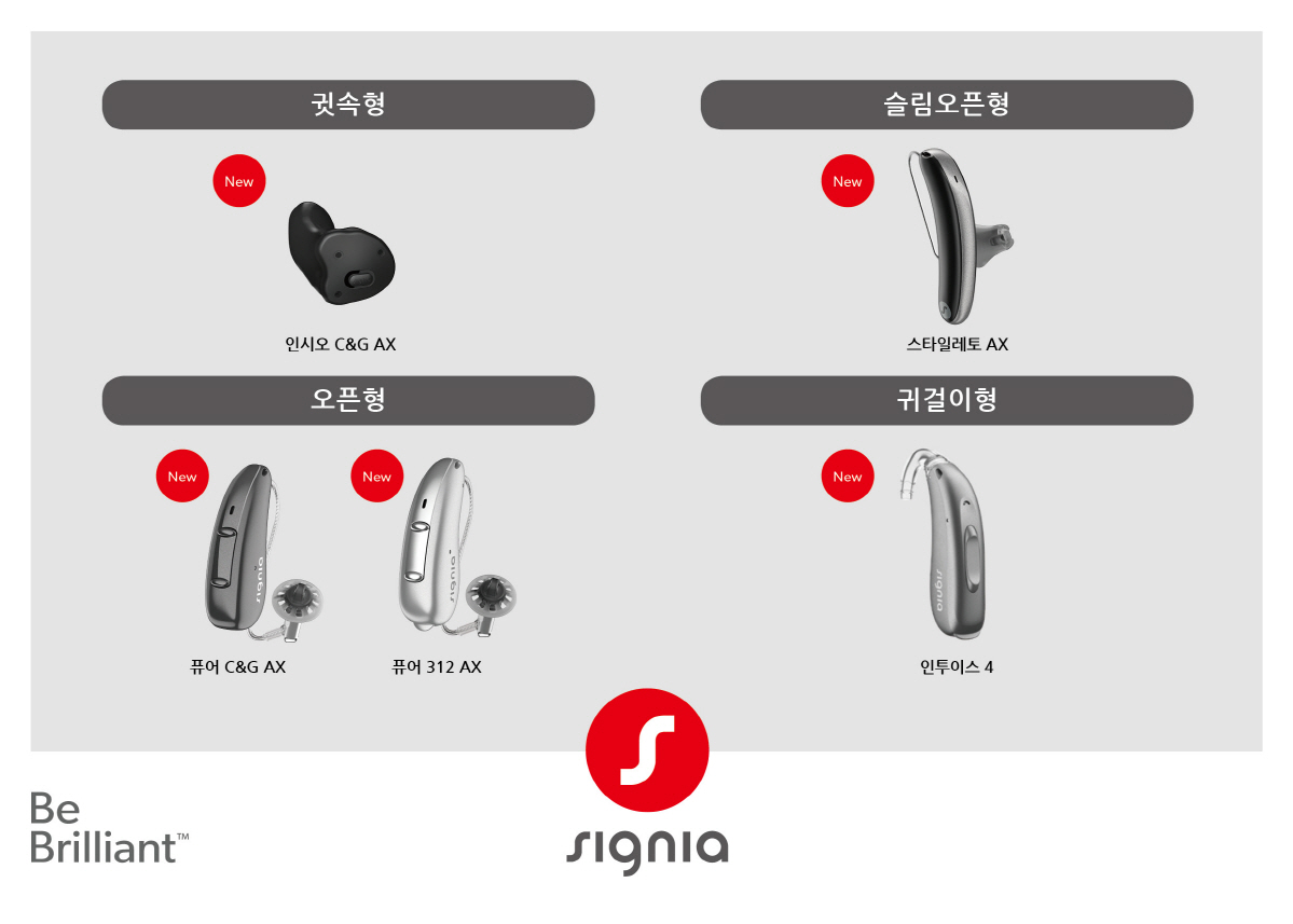 보청기에서 '플랫폼'은 하드웨어와 그 안에 탑재되는 소프트웨어 전체를 일컫는다. 가장 최근에 출시된 AX플랫폼에는 '사운드 분리 증강 기술(Augmented Focus TM)'을 적용, 목소리는 선명하고 배경음은 자연스럽게 들려준다. AX플랫폼 신제품 '에센셜' 라인은 귓속형부터 오픈형, 슬림오픈형 그리고 귀걸이형까지 합리적인 가격에 선보인다. 개인별 선호하는 디자인 및 난청 정도에 따라 선택, 경도에서 심도 난청인까지 시그니아의 다양한 기술력을 경험할 수 있다.