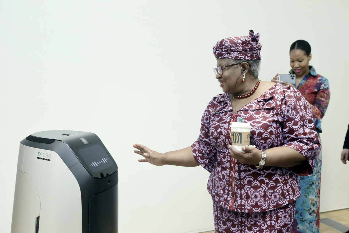 ◇지난 23일 경기도 성남시에 위치한 네이버 제2사옥 1784를 방문한 응고지 오콘조-이웰라 WTO 사무총장이 배달로봇 루키를 체험하고 있는 모습. 사진제공=네이버