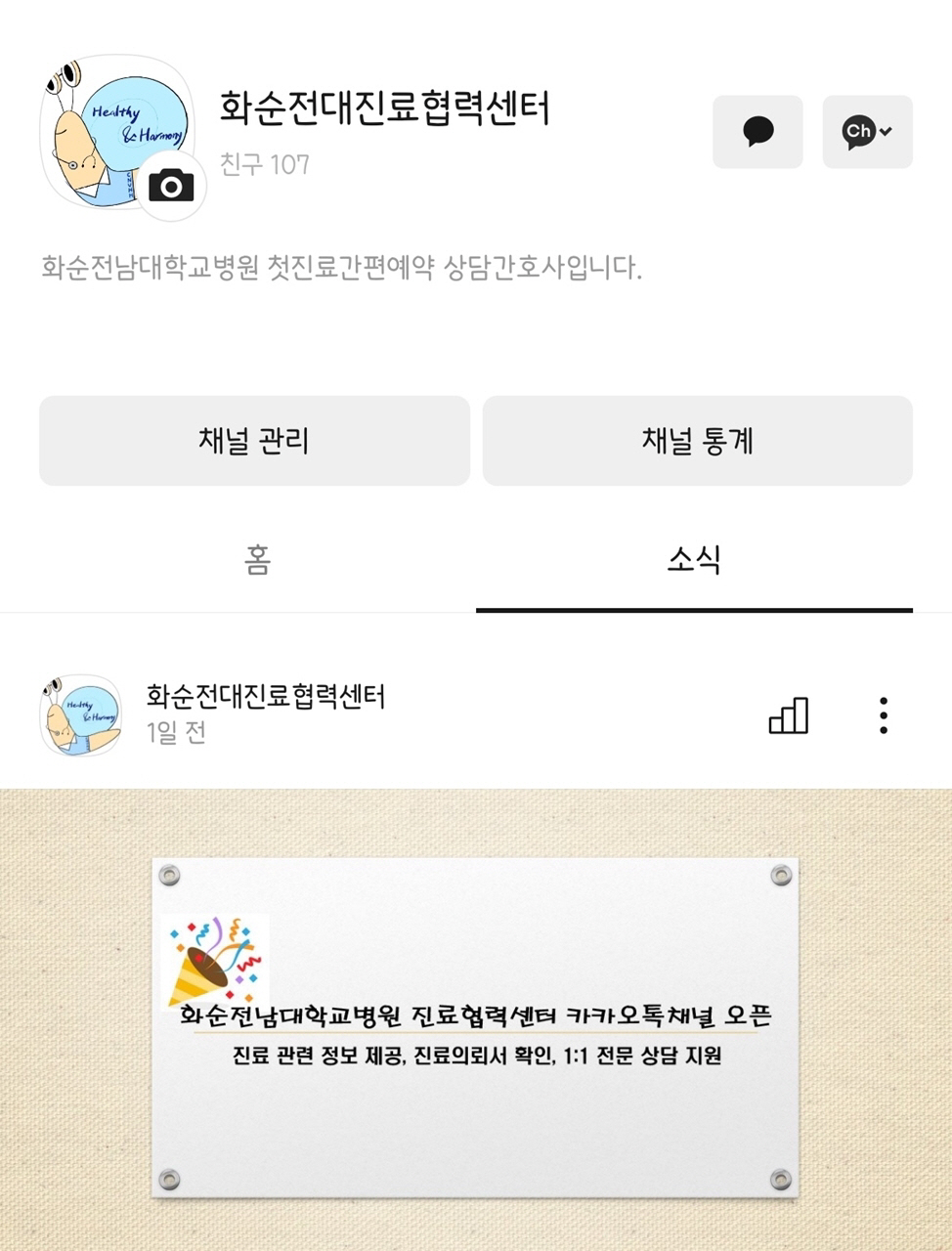 화순전남대학교병원이 진료협력센터 카카오톡 채널을 개설했다.