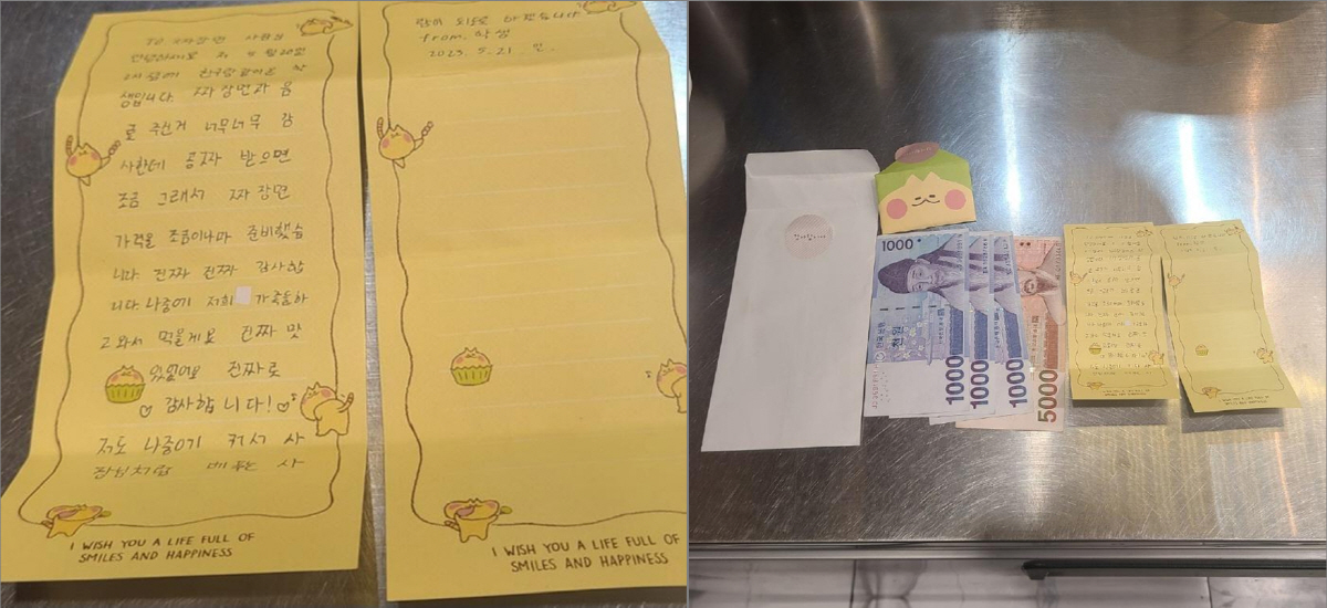 아이들은 "돈이 부족해서 한 그릇만 시킨 것이다."라고 하자, A씨의 아버지는 정량보다는 적은 양의 짜장면 한 그릇과 음료수 한 캔을 아이들에게 서비스로 더 줬다. 그러던 중 며칠 뒤 해당 초등학생들이 부모님과 와서 손으로 쓴 편지와 함께 현금 8천원을 가게 직원에게 주고 간 것이었다.