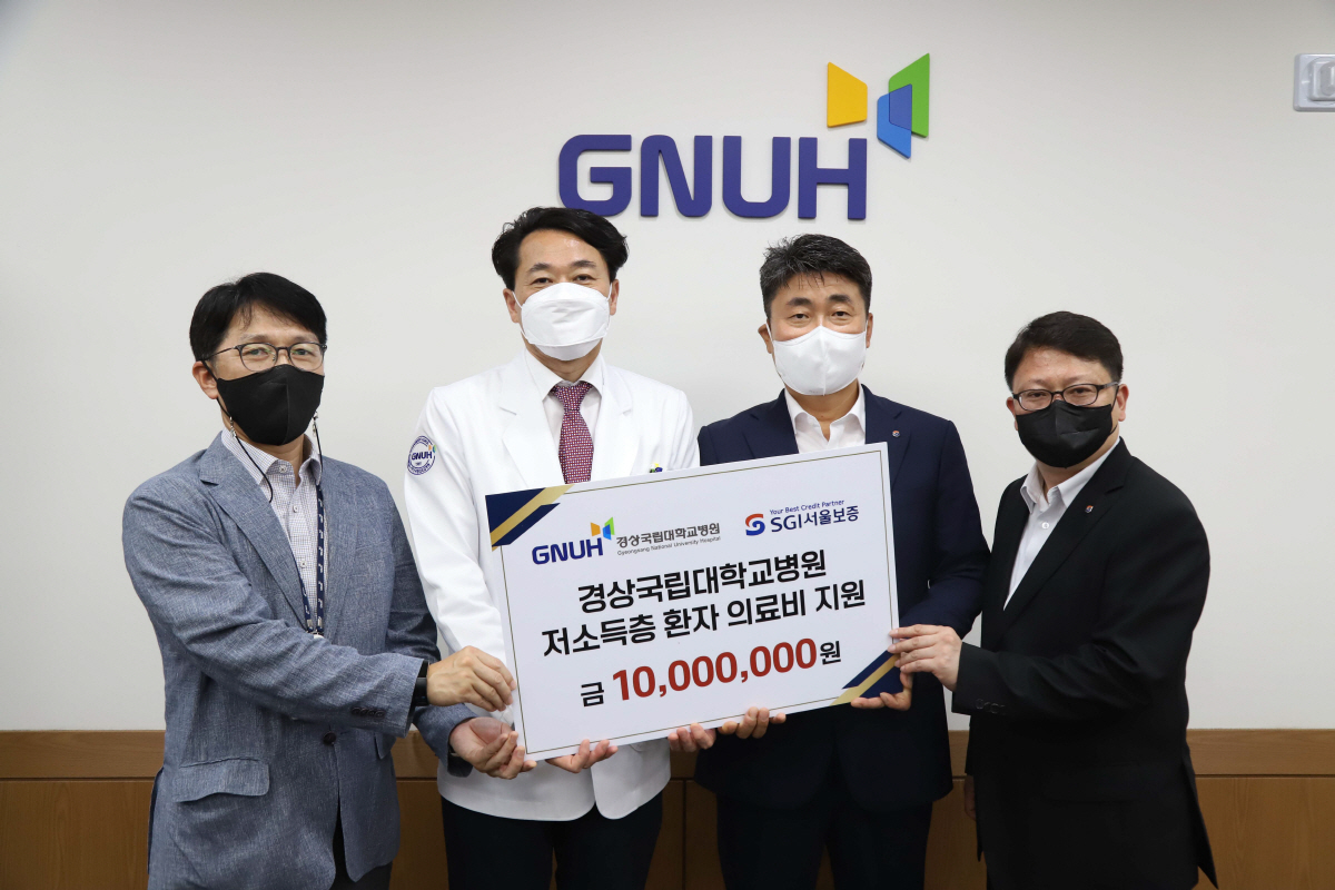 이날 기부금 전달식에는 안성기 경상국립대학교병원장, 류재병 경상국립대학교병원 총무과장, 김남필 SGI서울보증 부산경남본부장, 이상훈 SGI서울보증 진주지점장 등이 참석했다.