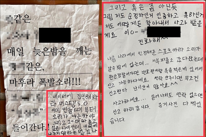 이에 A씨는 "밤 12시만 넘으면 시동을 걸고 나가길래 언제 한 번 싸움이 나겠구나 했는데 드디어 터졌다. 빨간색 테두리는 차주가 적은 글로 보인다."라며 사진을 공유하였다.