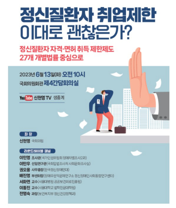 국회 보건복지위원회 신현영 의원(더불어민주당)이 오는 13일 오전 10시 국회의원회관 제 4 간담회의실에서 '정신질환자 취업제한 이대로 괜찮은가?-정신질환자 자격·면허 취득 제한제도 27개 개별법률 중심으로' 토론회를 개최한다. 토론회는 유튜브 신현영 TV에서 생중계될 예정이다.