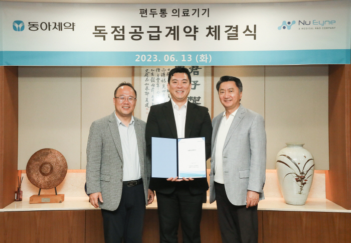 동아제약이 지난 13일 서울 동대문구 본사에서, 전자약 연구개발 전문 기업 ㈜뉴아인과 편두통 완화 의료기기의 국내 독점 판매 공급 계약을 체결했다.