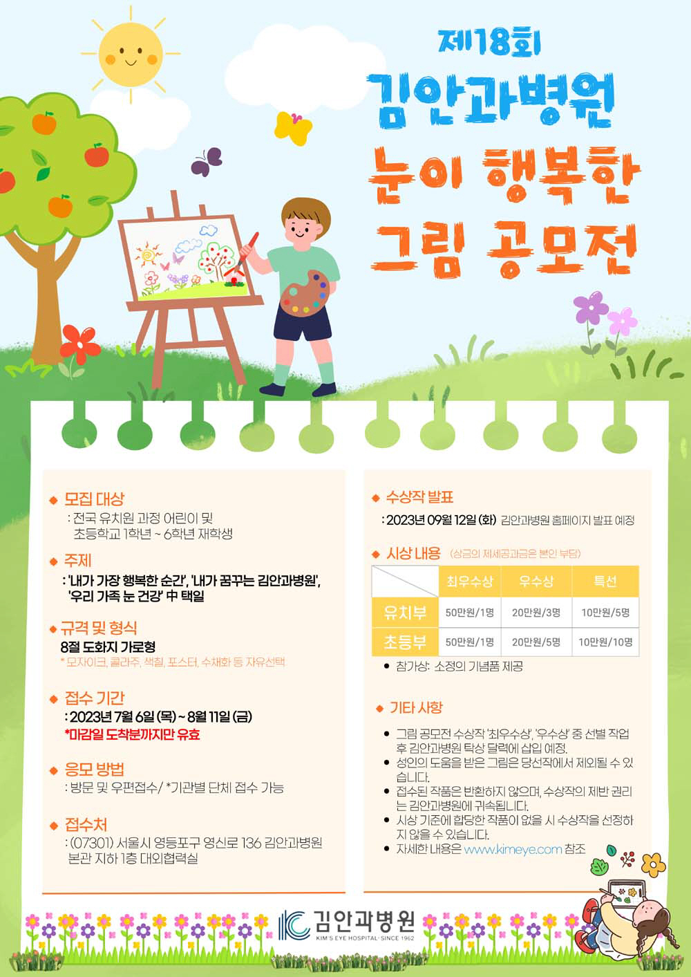 건양의료재단 김안과병원(원장 김철구)은 6일부터 약 한 달 동안 전국 유치원 과정 어린이들과 초등학교 재학생을 대상으로 '제18회 눈이 행복한 그림공모전'을 개최한다.